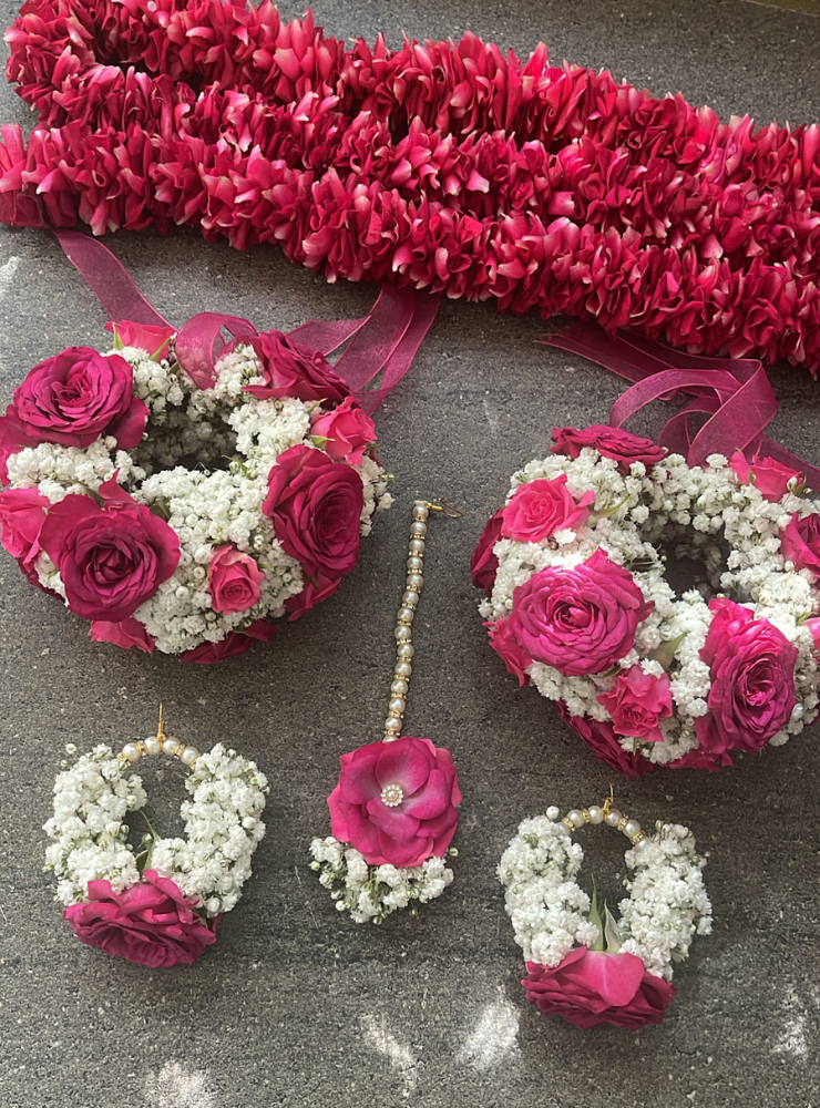 Be the first to review “BS64 Cerise Bridal Set With Rose Petal Hair Gajra” Cancel reply